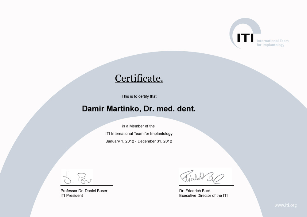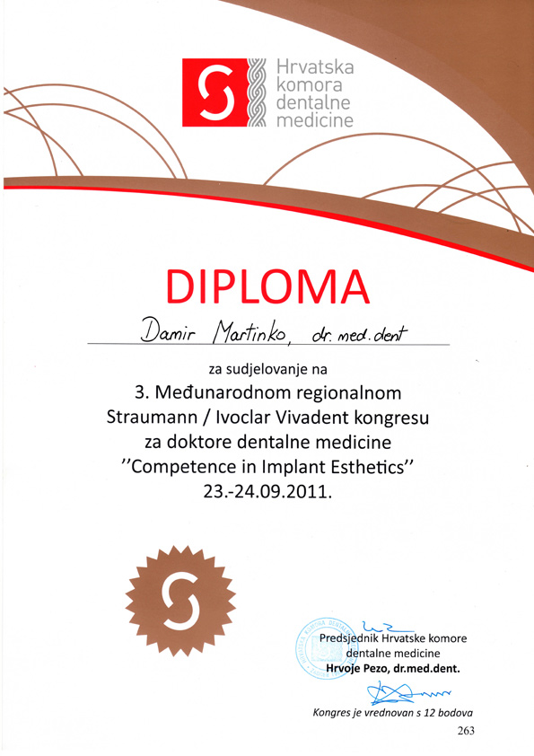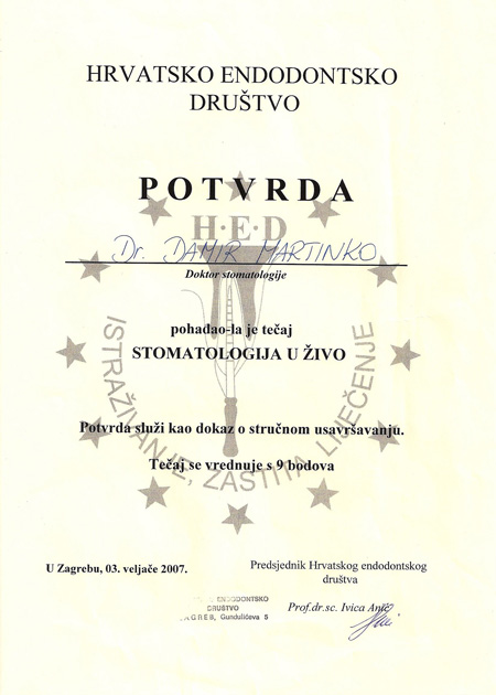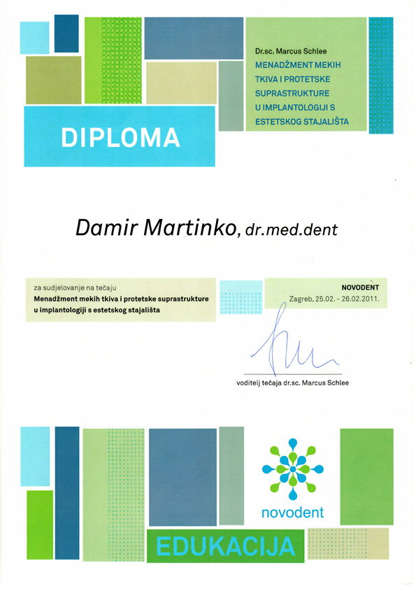 - 2006. „Intensive seminar for Dental Implantology”, Međunarodni edukacijski centar za dentalnu implantologiju; prof. dr. Manfred Lang u ime Sveučilišta u New Yorku (Nürnberg, Njemačka)