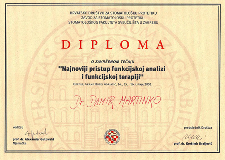- 2001. „Najnoviji pristup funkcijskoj analizi i terapiji”, Hrvatsko društvo za protetiku; prof. dr. Alexander Gutowski, Austrija (Opatija, Hrvatska)