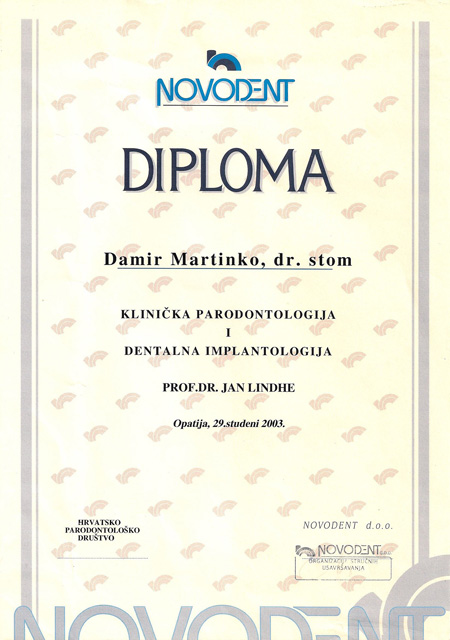 - 2003. „Klinika paradontologije i implantologije”, Hrvatsko društvo za parodontologiju; prof. dr. Jan Lindhe, Švedska (Opatija, Hrvatska)