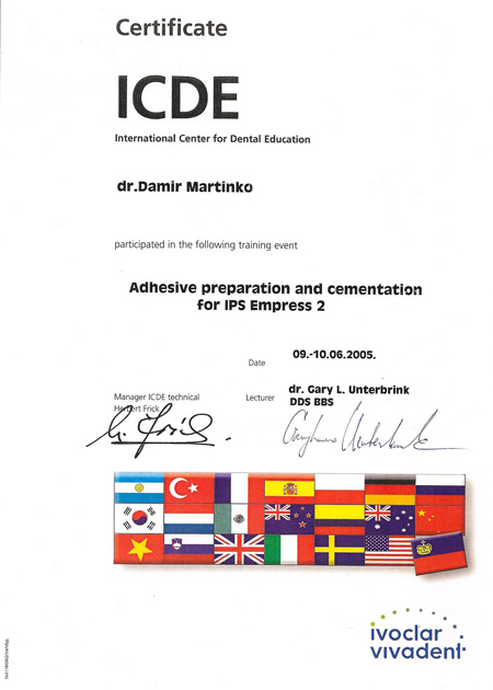 - 2005. „Adhesive preparation and cementation for IPS Empress2”, Međunarodni centar za dentalnu edukaciju (IVOCLAR VIVADENT), dr. Gray L. Unterbrink (Schaan, Lihtenštajn)