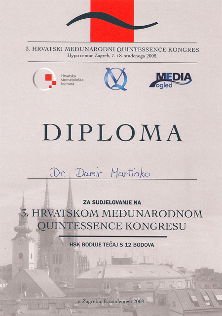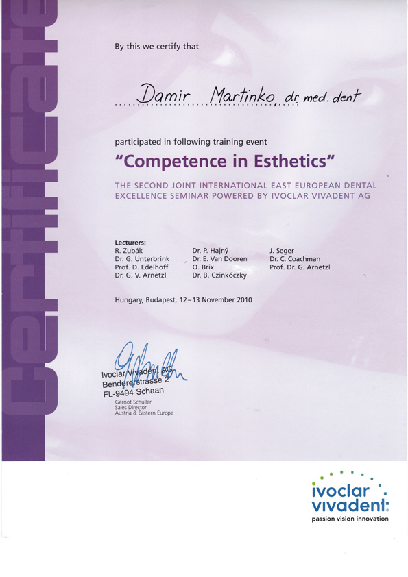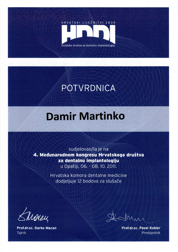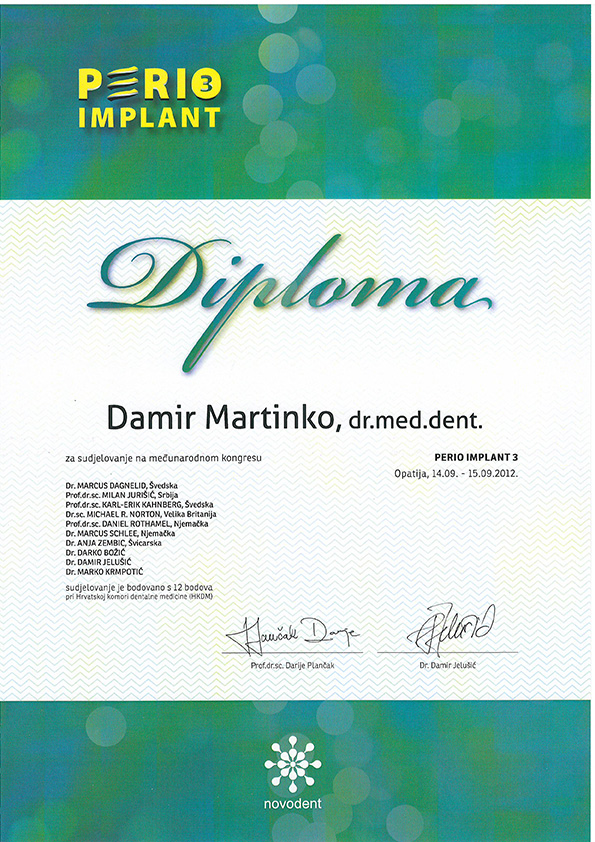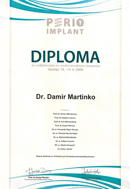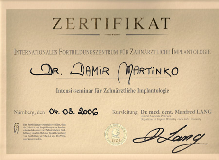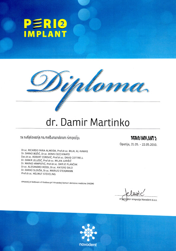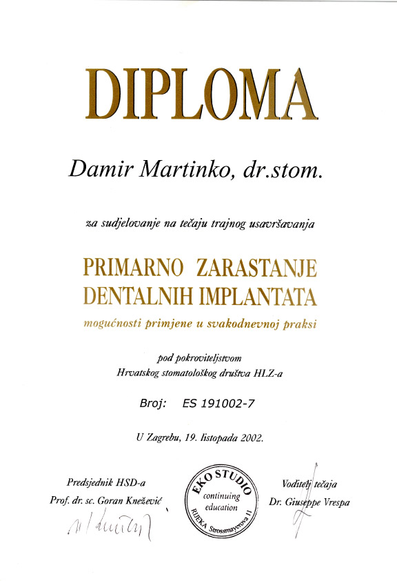 Il nostro Centro ha le sue fondamenta nella capacita', esperienza ed entusiasmo del dott. Damir Martinko. Specializzato in chirurgia odontostomatologica presso l'Universit? di Zagabria, il dott. Martinko partecipa regolarmente ai corsi di aggiornamento in Croazia e all'estero: