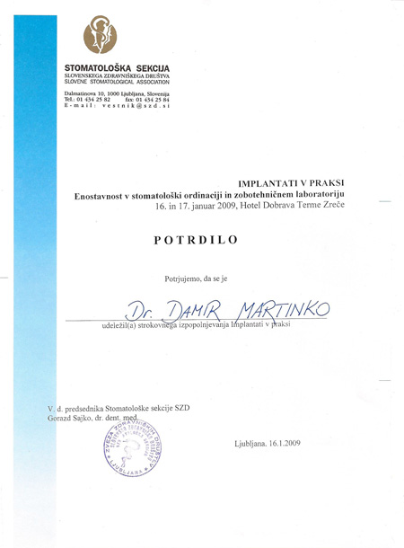 - 2009. „Implantati v praksi”, dr. dent. med. G. Sajko (Ljubljana, Slovenija)