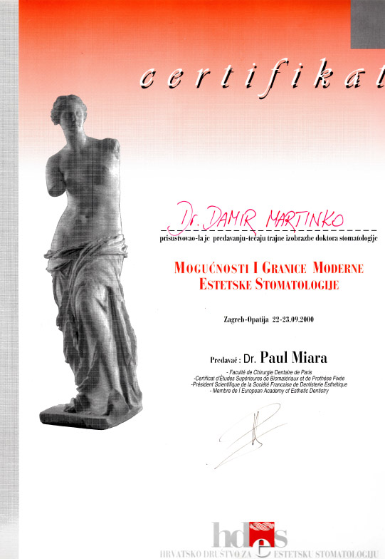 - 2000. „Mogućnosti i ograničenja u modernoj estetskoj stomatologiji”, Hrvatsko društvo za estetsku stomatologiju; dr. Paul Miara, Francuska (Zagreb, Hrvatska)